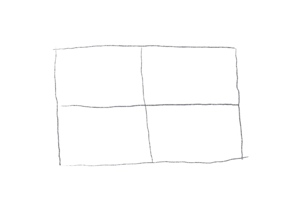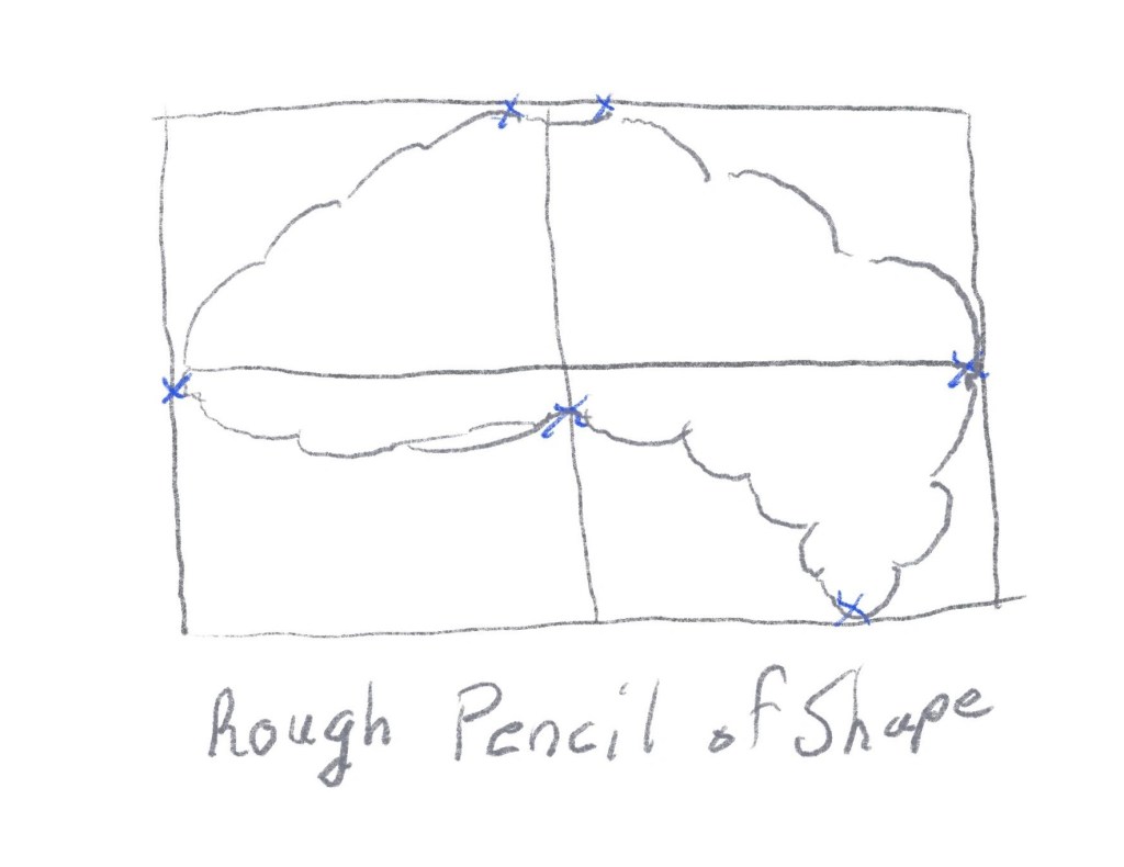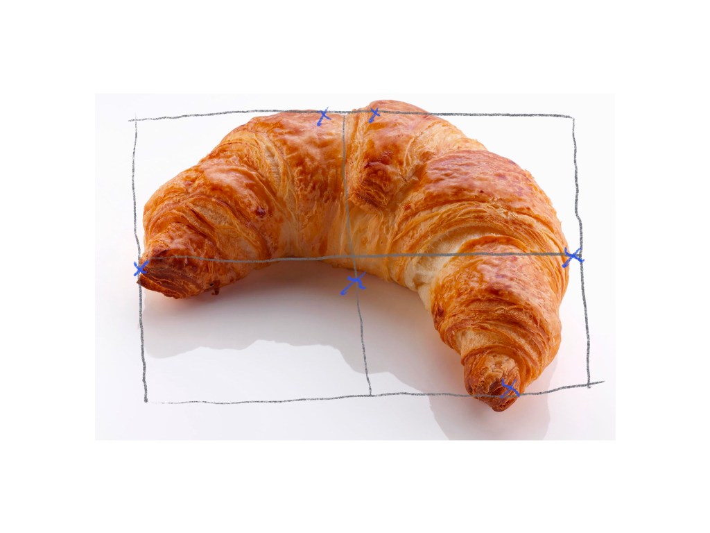 Start with a lightly penciled rectangle that would enclose the croissant, then divide it into quarters as on the right. Next note where the croissant would touch the lines, light marks are quite ok. Then it is quite easy to sketch in with pencil the general outline of the croissant. Remember, there is no perfect croissant, at least in appearance, though I have had a few that approach perfection in taste and flakiness – so don’t obsess over detail or perfection.