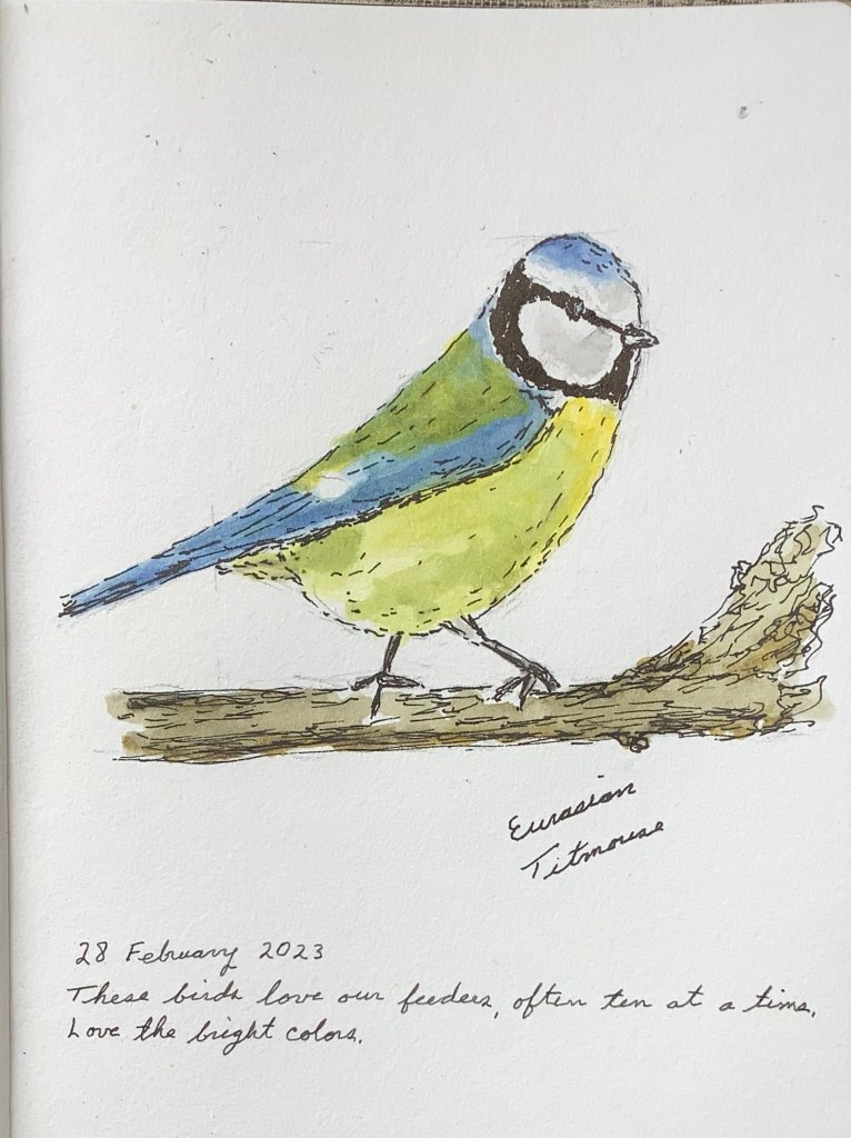 Spring is approaching; there is nothing like the twitters and activity of our colorful birds to lift one’s spirits. These Eurasian Blue Tits with there shimmering greens and blues just love our feeders.