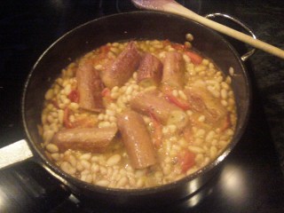 Brown Italian, or other smoky sausage such as a Polish. Remove and set aside. Then add two cups or so of small tomatoes halved, or quartered depending on size to the still warm pan, if too dry add a bit of olive oil. Add a clove of garlic chopped along with herbs, whatever is available, and two cans of white beans, drained, salt and pepper to taste. Turn heat to a low and simmer for 10 minutes. Add the sausage back and simmer for another 10-20. Its ready.