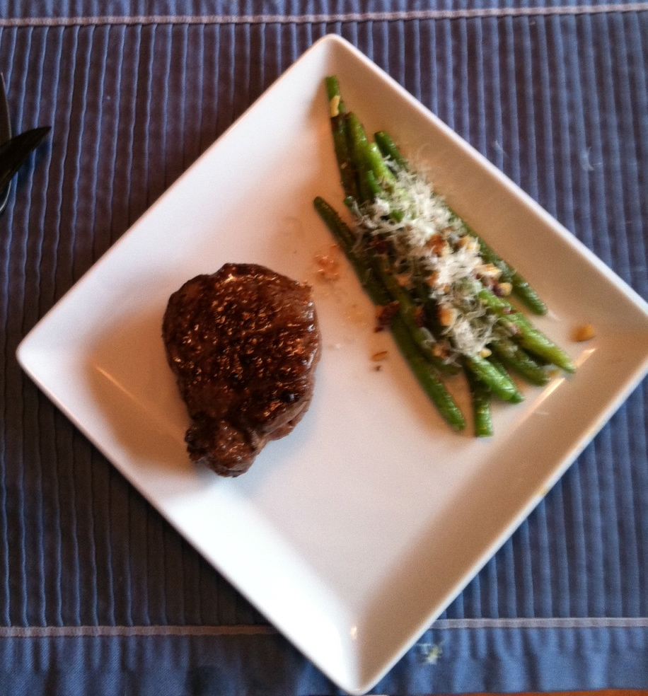 This meal was a tenderloin, along with green beans that were sautéed with hazelnuts.