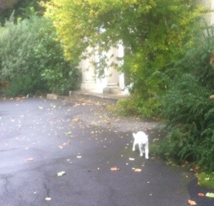 We met a friend, from behind a shrub a small white cat almost ran up to say hello, as if waiting for some company. He rubbed up against our legs and followed for a bit, then led the way through part of our walk.
