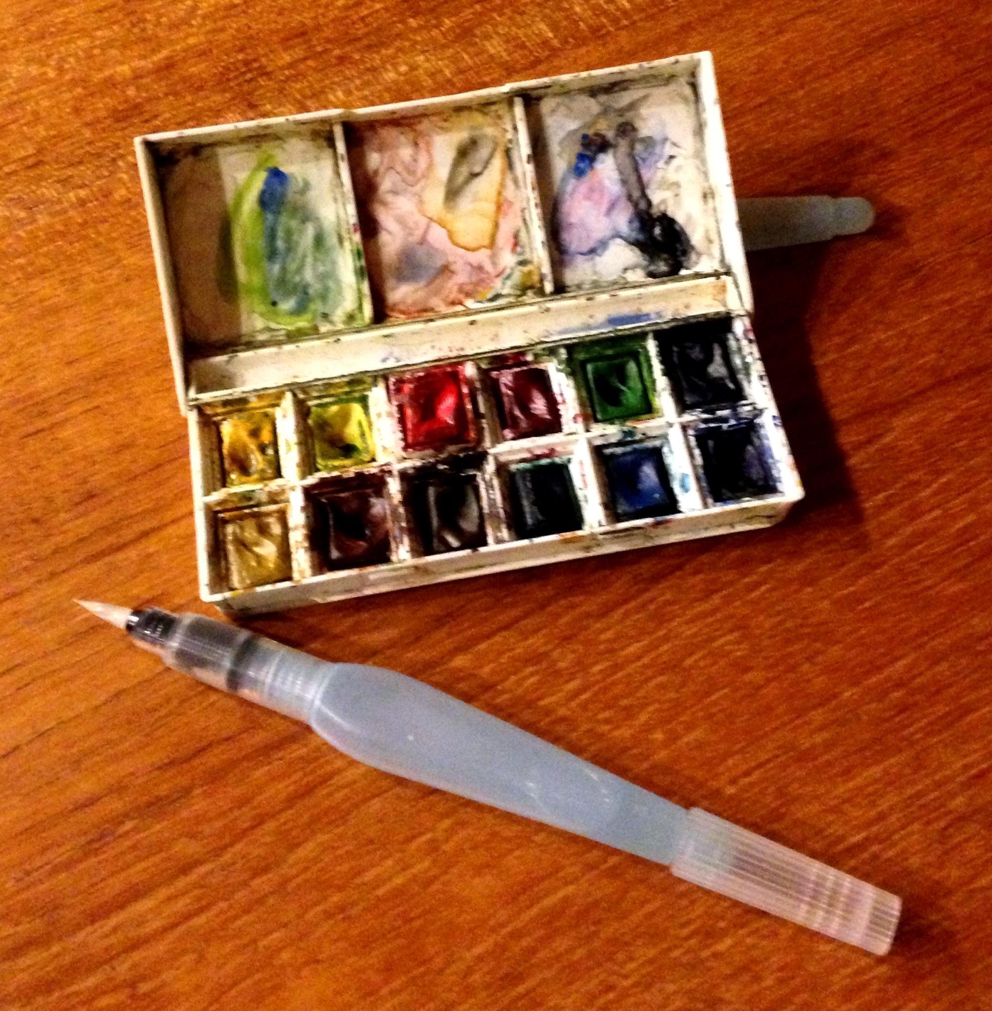 You can go less expensive and make your own sets using metal breath mint containers. The large size can hold 10-12 colors, or 8 with room for a short pencil and brush, the mini-mint tins can hold about 5. That may not seem like a lot, yet I find that 80% of what I paint comes from no more than 6 colors, so I probably could survive a few sketches with the mini, and it is so small. Remember, we are travel sketching here, not studio masterpieces.