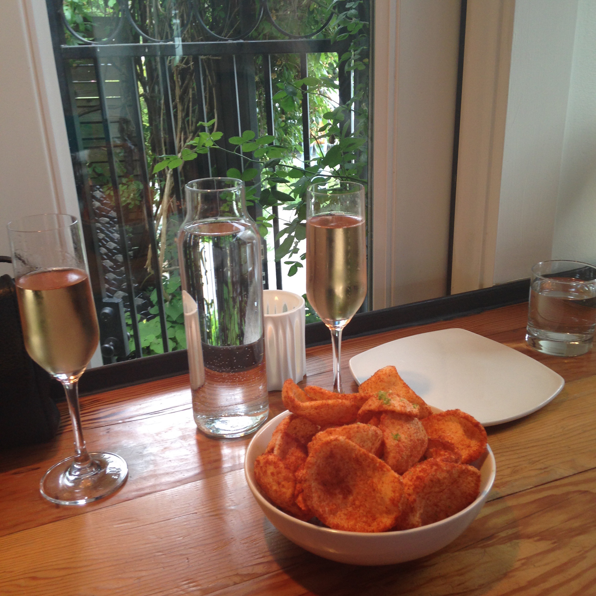 Of course started with bubbles, and to go with them we had Tapioca Puff Chips, with chili-lime sauce. They could sell these by the bag and I would give up potato chips for a long time. Light, a bit picante, with the promised lime – my kind of snack.