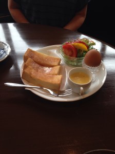 The desire to find someplace dry, and the need for tea, coincided with us finding a tiny cafe. I had my morning matcha, a habit I am sure will continue, and we shared a breakfast set of hard cooked egg, toast, salad, and a sauce that was heavy in butter but not sure what else. The place was decorated almost British with classical music, and the most delightful couple attending to us.