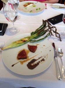 I had steak, now for all of you American Cowboy folks, this was not like anything you have tried. First of all the size,  check the photo, it was two servings, each of 1 ounce, no 16 ounce monstrosity here. Each piece was probably more fatty than the America pallet likes, but each tiny bite was heaven, the foie-gras was a perfect seasoning, I can only think of one steak ever that came close. (Read my blog on Brimmer & Heeltap)