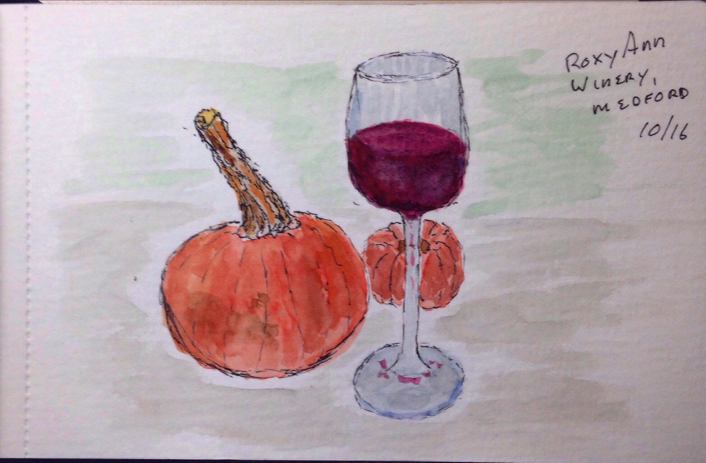 Yesterday I discovered Rogue Valley wineries, I learned that Wine Enthusiast ranked this area in the top ten wine tourism destinations. Since tasting rooms stay open until 7.00pm here it made sense to check out a tasting room. RoxyAnn was closest to my hotel so I headed there. It is a huge old farm now winery. I tried their table red, which was fine, but not great, and did a sketch. Sadly though, I never felt welcomed, there were quite a few folks there, obvious regulars, but once I ordered no one ever checked to see if I needed anything else.