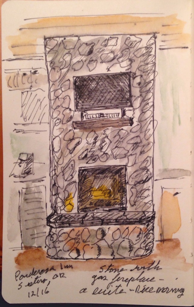 After a snowy drive across Santiam Pass, we spent the night at the Ponderosa Inn, what a delight. Thanks to many days of traveling the suit was free, but check out this fireplace in the living room.