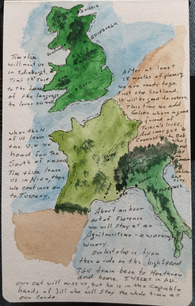 Europe, Europe 2017, Painting, pen, Travel, Travel journal, Watercolor Scotland, here we come! Posted by Terry Christopherson on September 25, 2017 After at least 18 months of planning, we leave in 4 days. Hard to believe it is time. Share this: Click to share on Facebook (Opens in new window) Facebook Click to share on Pocket (Opens in new window) Pocket Click to email a link to a friend (Opens in new window) Email Click to share on Tumblr (Opens in new window) Tumblr Click to share on Pinterest (Opens in new window) Pinterest Click to share on Bluesky (Opens in new window) Bluesky Like Loading...