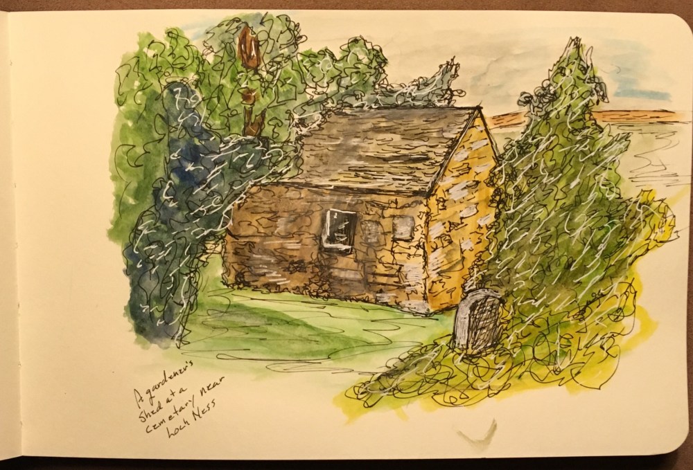 Europe 2017, sketch, Travel A gardeners shed on the banks of Loch Ness Posted by Terry Christopherson on January 2, 2018 We visited this old cemetery, this is the stone caretaker’s shed, Loch Ness is in the distance. Share this: Click to share on Facebook (Opens in new window) Facebook Click to share on Pocket (Opens in new window) Pocket Click to email a link to a friend (Opens in new window) Email Click to share on Tumblr (Opens in new window) Tumblr Click to share on Pinterest (Opens in new window) Pinterest Click to share on Bluesky (Opens in new window) Bluesky Like Loading...
