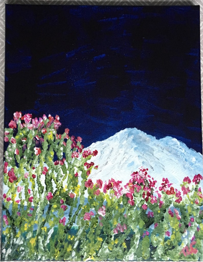 There are dark skies these days, it is in times like these that the light is brighter and the flowers most appreciated, I cling to that. This is an acrylic on a 9×12 canvas, prints available.