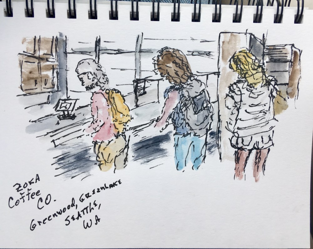 Suhita has a style that is quite loose, using many earth tones, people are prominent in most of her sketches, lots of darks to contrast with the lights. Suhita is known for people sketches, and I tried so hard to sketch them like she does, it was disaster. Then I stepped back and looked at what it was about how she sketched that I liked. I learned that my sketches of people in cafes did not have to be detailed portraits, that the rhythm and the shapes of the person and place is what mattered most, and that color was optional, sometimes just shades of gray worked.