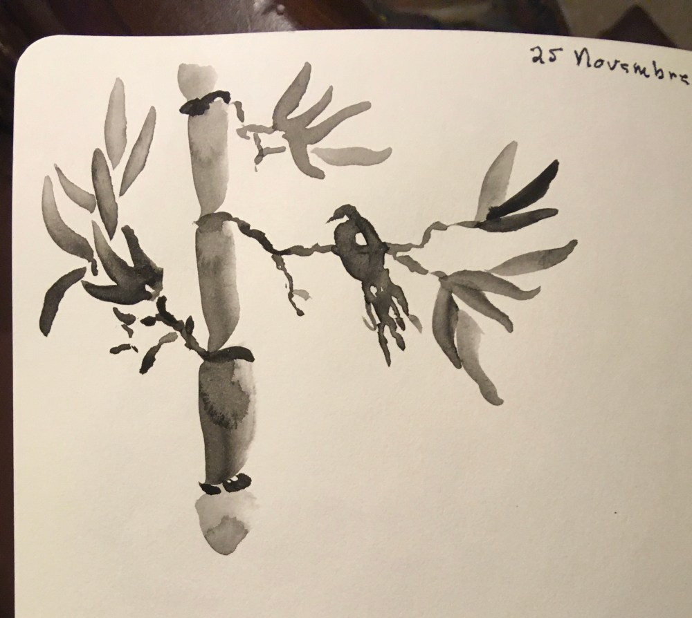 Thanks to internet and YouTube I started off on a new art adventure that has captivated me. The brushes bend and stay bent, brushstrokes are magic, the art is expressive. My travelsketching is often detailed, Sumi-e strives to capture a feeling with a few strokes, and gray tones of ink. I am hooked.