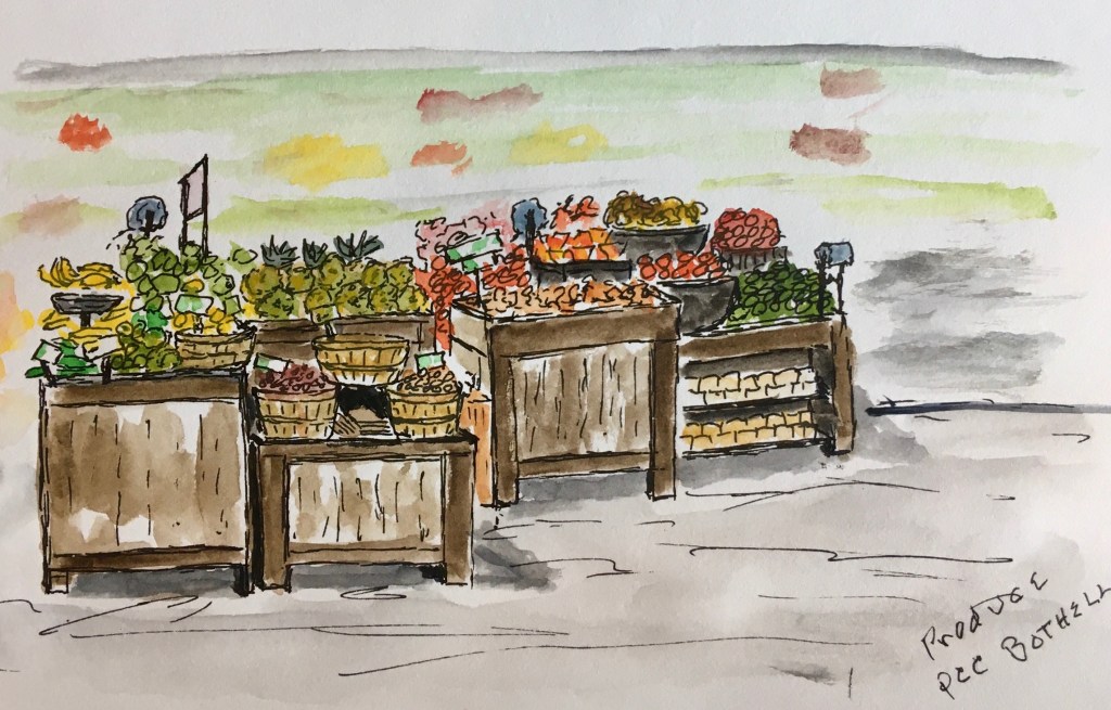My varied sketching techniques continued – an ink and watercolor of the produce department at PCC in Bothell for next weeks Mukilteo Beacon, more Sumi-e ink style sketches, and of course the three men. I find that learning new techniques helps with older techniques, art is all about learning.