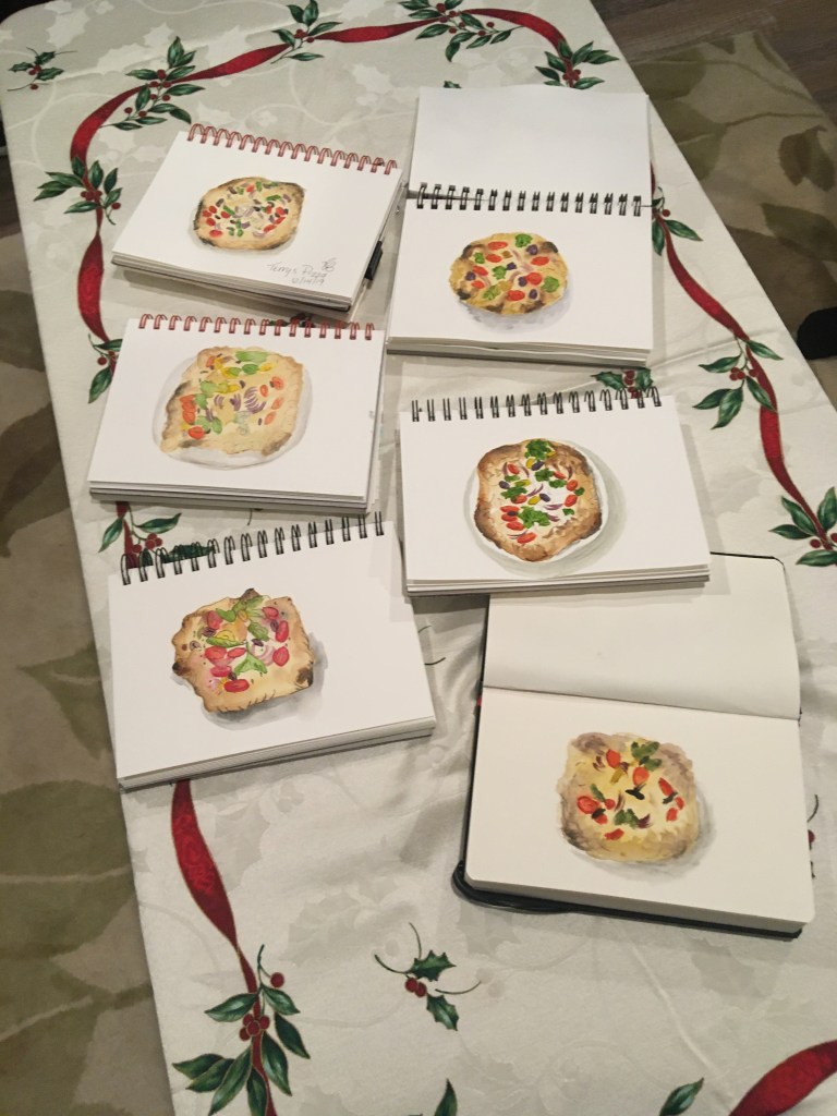 We went back to some basics, a few folks had little or no sketching experience, all came through brilliantly. We sketched San Gimignano in Italy from a distance, and then a pizza for a whole different challenge.
