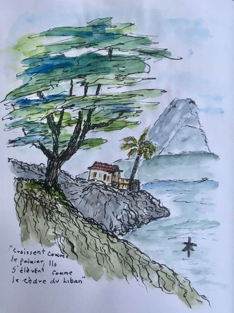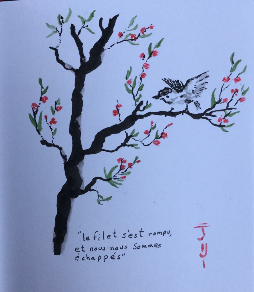 For as long as I can remember I have been an early riser, mornings are my time to sip tea, get depressed by the news, then refresh and renew with meditation and prayer. Interpreting those thoughts in Sumi-e style paintings makes them much more meaningful. Adding a few words of French is good language practice as well.