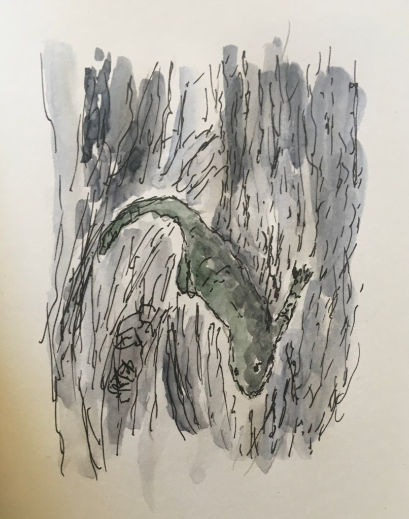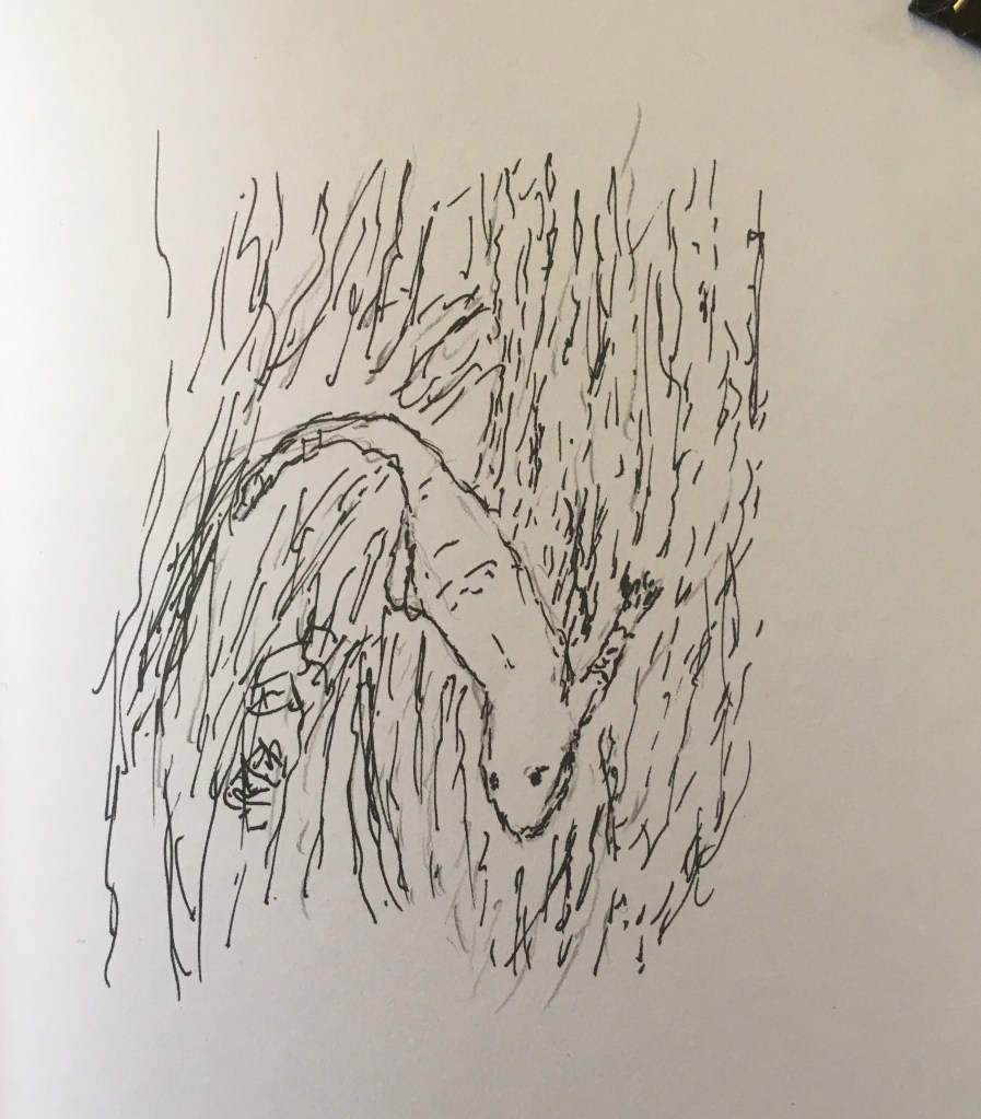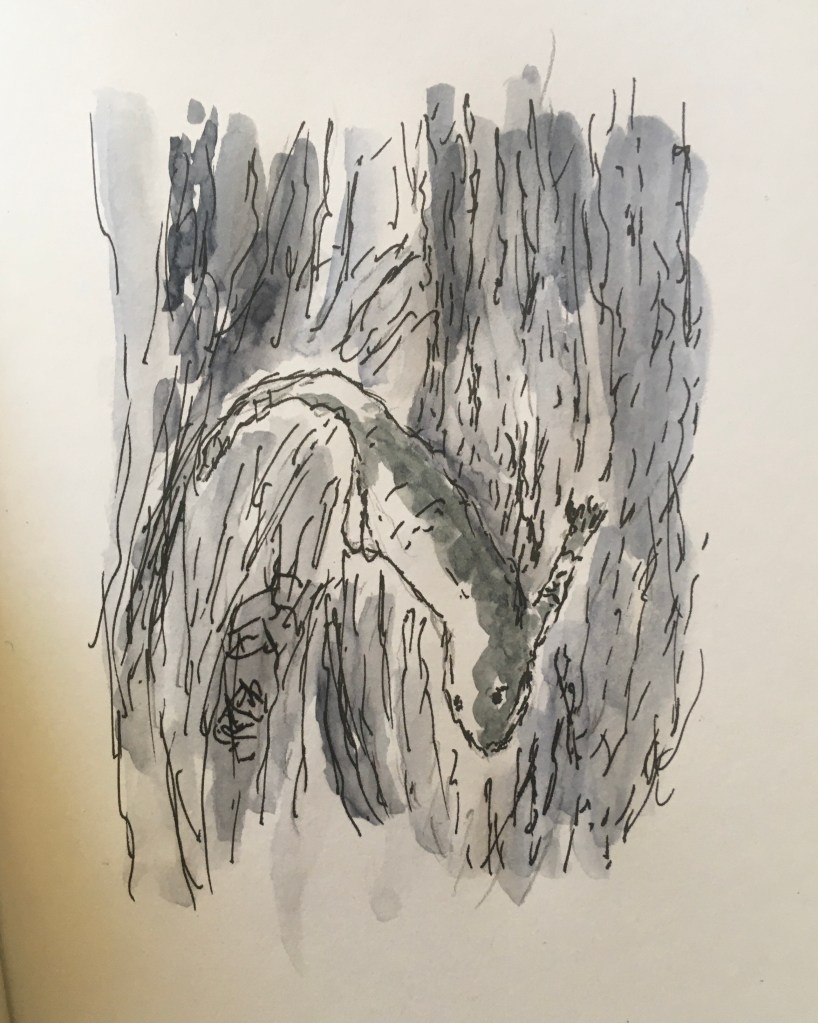 From the lizard’s perspective she must be glad that we have trouble making her stand out, her camouflage is her protection. To sketch we have to observe closely and use what we can. Two key tools will be the textures and the dark areas, specifically where the body of the lizard is next to the tree.