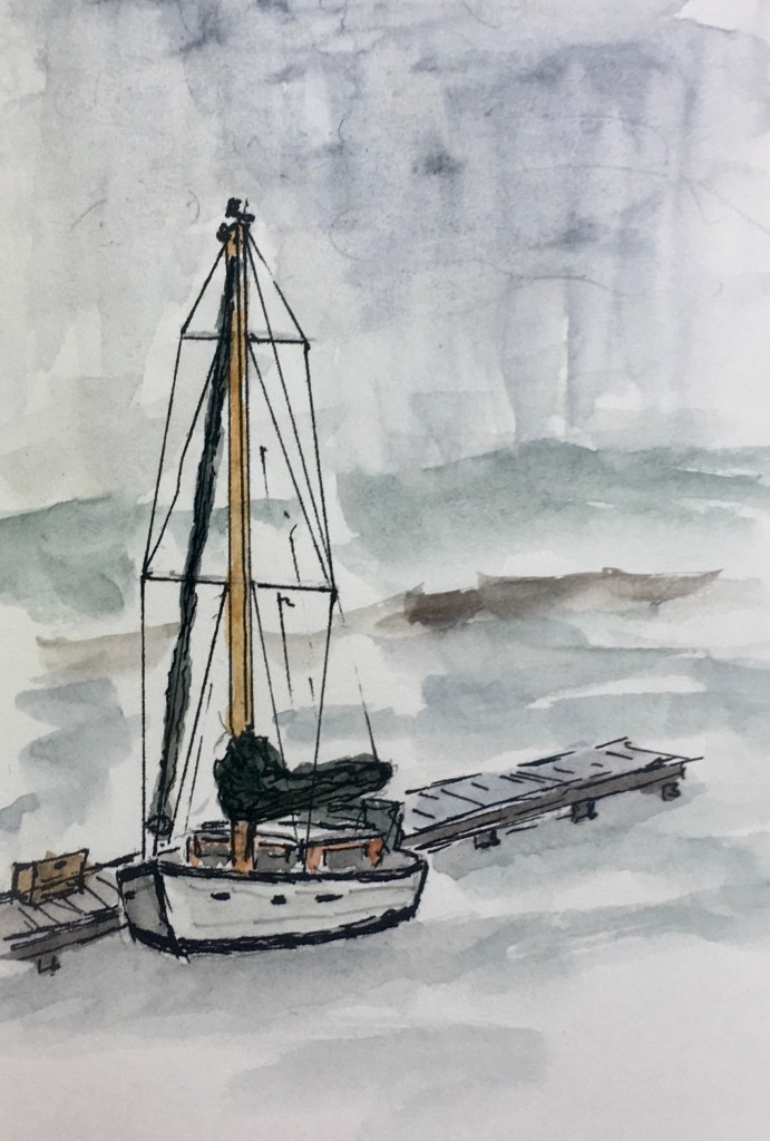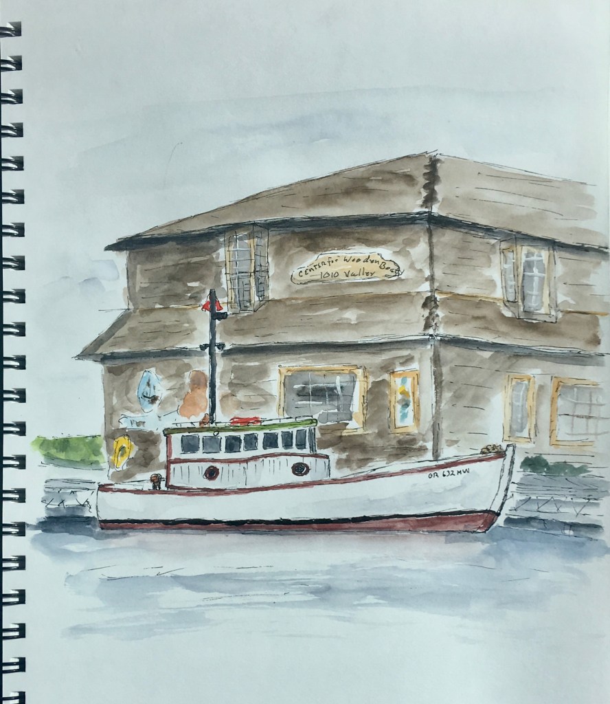 During the summer I would venture out for brief periods, most frequently to South Lake Union, Tricia, considered an essential employee had to spend a few hours a week at her office, so I would be chauffeur, then spend the time away from people, but near boats at the Seattle Center for Wooden Boats, sitting on docks with sketchpad.