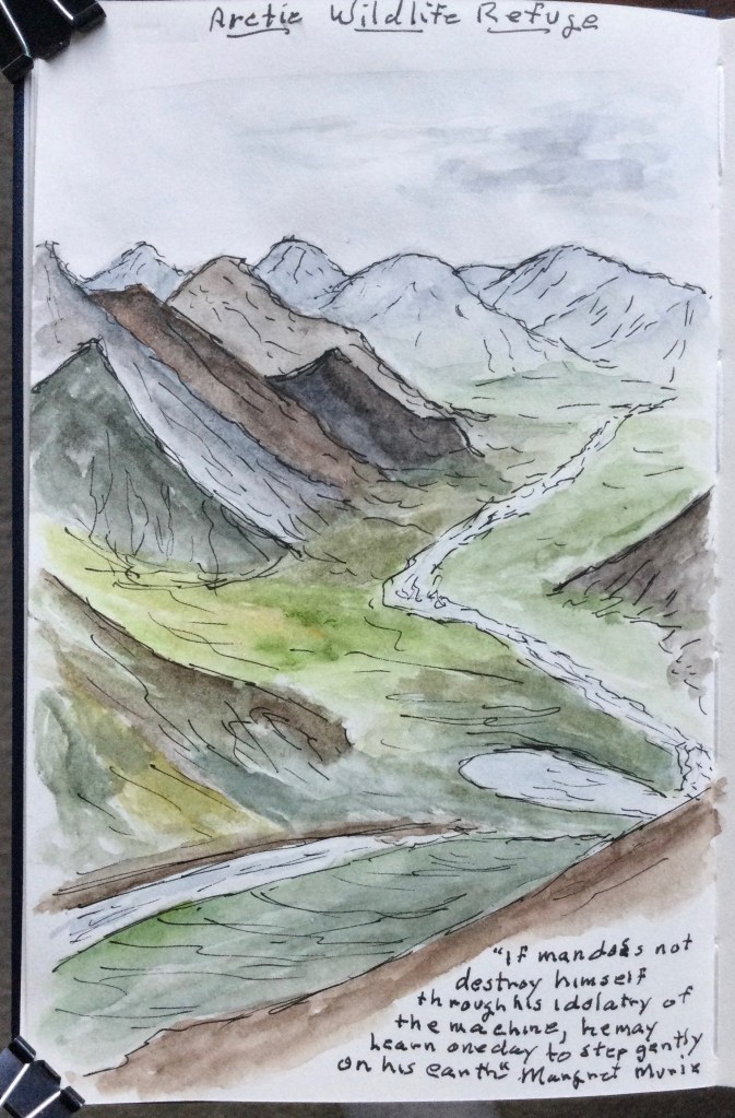 Recently we watched The National Parks: America’s Best Idea by Ken Burns then I read the book Two in the Far North by Margret Murie. Margret and her husband, Olaf Murie, were instrumental in the formation of the Arctic Wildlife Refuge. So my mind turned to National Parks and the Arctic. First came an acrylic on canvas of Joshua Tree National Park, then a couple of sketches of the arctic.