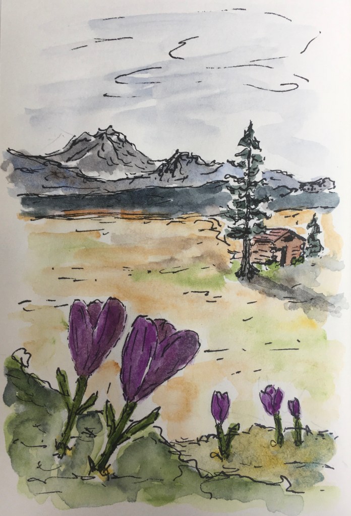 Then a sketch of Japanese Gulch, where the workshop will take place. I finished the week with a few fleur d’iris in a clay pot. I hope you are all well, and sketching.