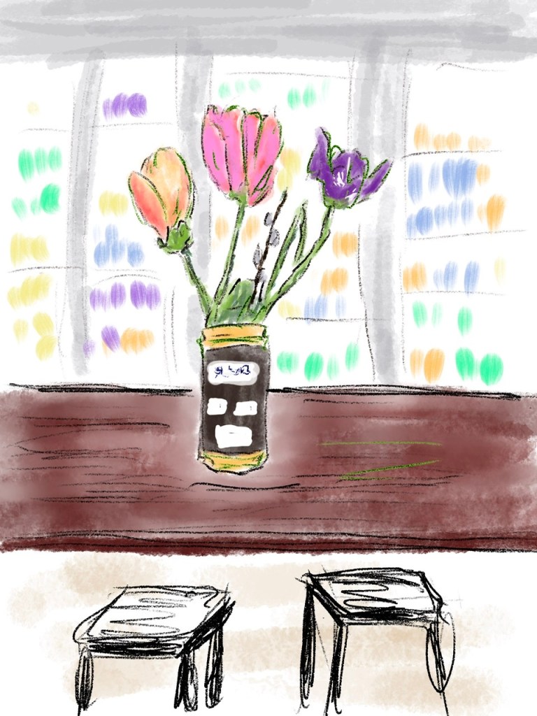 Tuesday I started the day at Red Cup with a dry cappuccino, next time I ask for less foam. Then I stopped at Tapped in Mukilteo to meet with the manger to discuss some art projects, sketched tulips on the table there. They are quite involved in the arts so it might lead to some projects in the future.