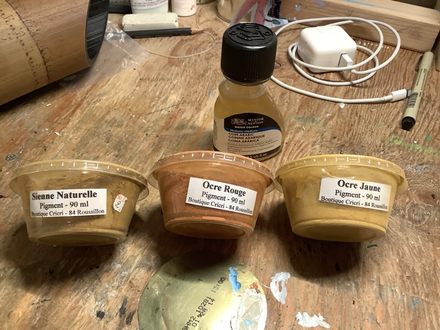 On our 2017 trip to France I bought some raw pigments in Roussillon, a village in Provence that is known for its ocher color and pigments. Thursday I finally decided to attempt making my own watercolors from them, and doing a monochrome sketch. I plan to set up my mini-arttoolkit pallet with three of the colors and black.