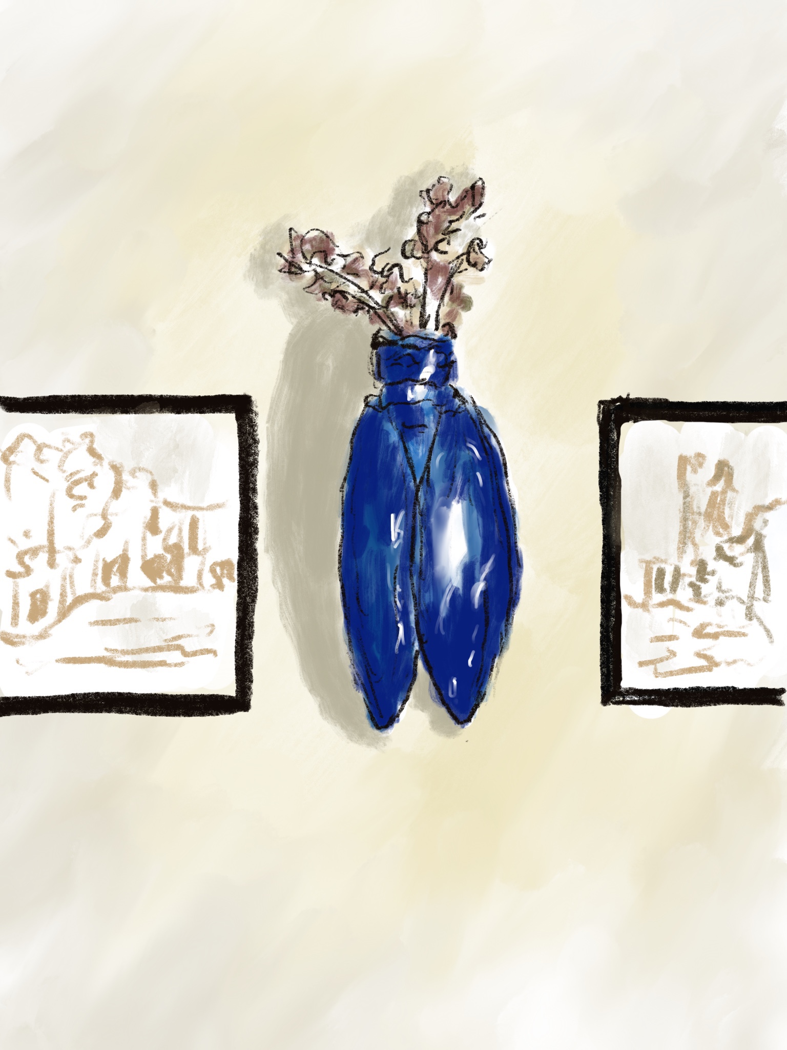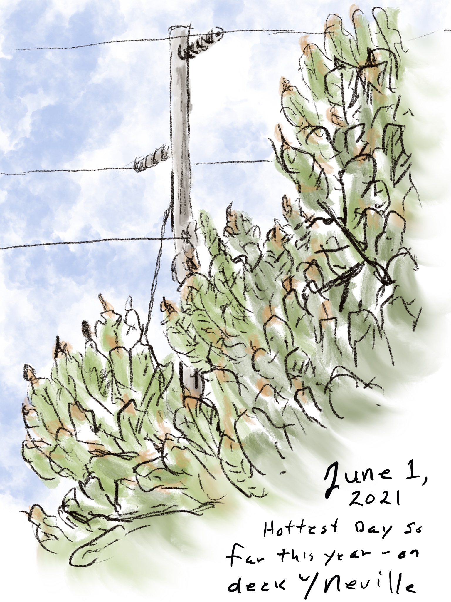 Then of course there is always the joy of just sketching what is around you at home. A blue cicada vase we got many years ago in Provence, these vases are a common sight in Provence as they are a sign of good fortune. While enjoying the sun with Neville on his catio I sketched tree branches and wires.