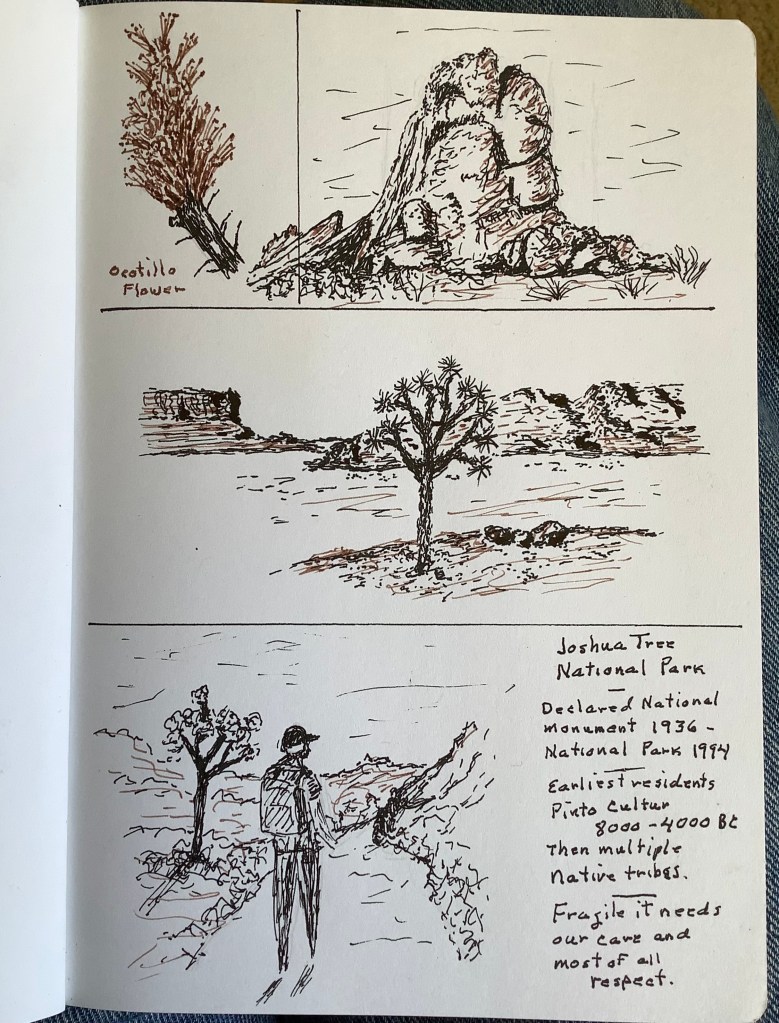 The first sketches in ink last week, done with fountain pen these days, were of Joshua Tree National Park. My thoughts are often about nature and National Parks are a national treasure. My second was of Phare de Cordouan in France.