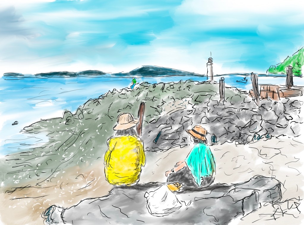 The fountain pen sketching was fun, so why not do ink sketches on iPad? And why limit myself to the real world around me? The result was a couple from my imagination: wandering in the desert, and watching a boat sail by. I added a bit of color for interest.