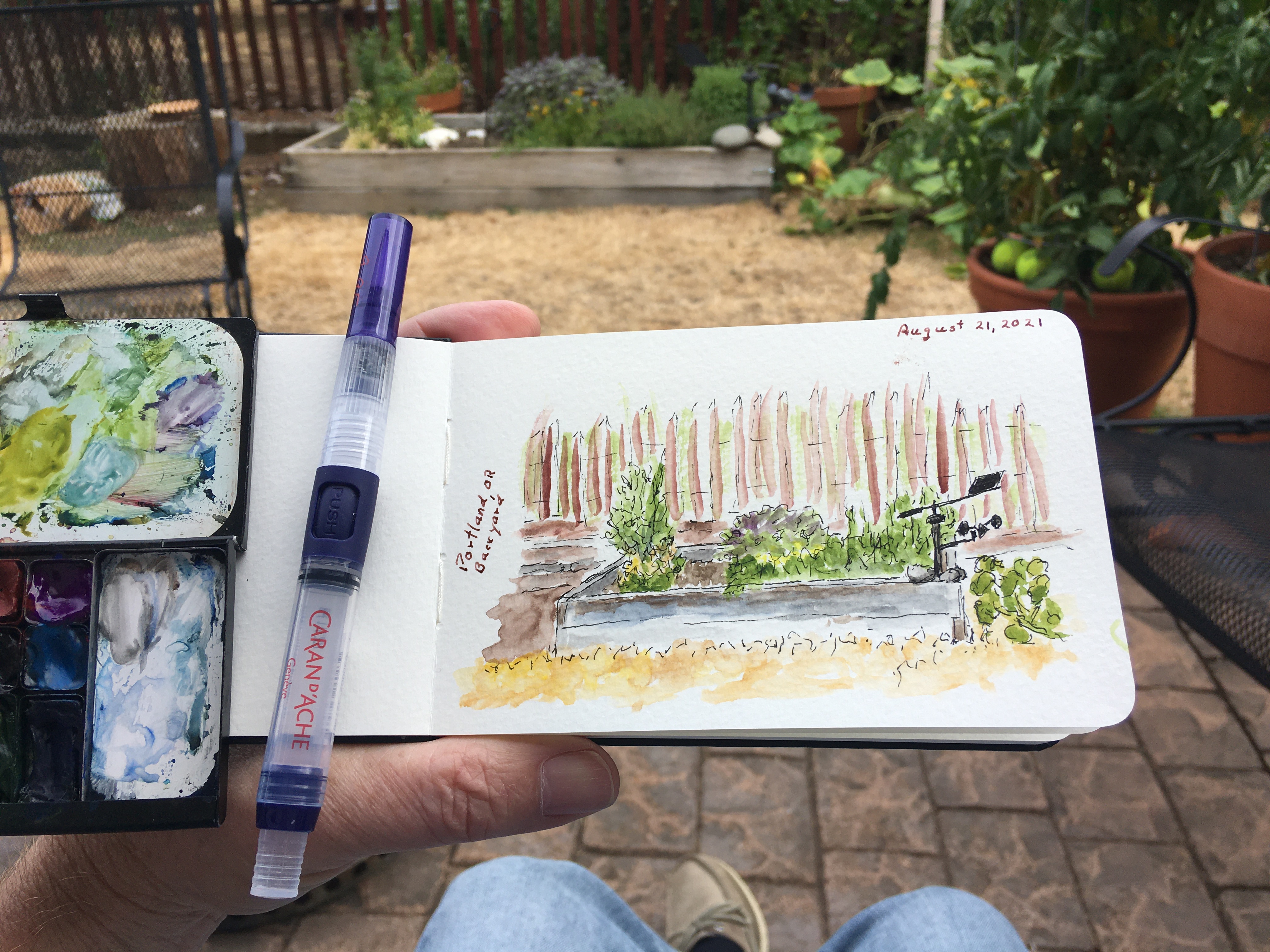 This is the terroir of sketching. We sketch what is around us, I live near the mountains and Puget Sound, so those images are frequent, when on a trip it is the places we visit that are the terroir. Yet there is a deeper terroir, what catches the sketcher’s attention regardless of where they are. For some it is the people, others the buildings. If a group of sketchers go to a coffee shop to sketch, some will fill pages with the people in the cafe, the architecture only serves as framing for the people. Me, I tend to sketch the counter, the cafe itself, adding people as interest to the overall scene.