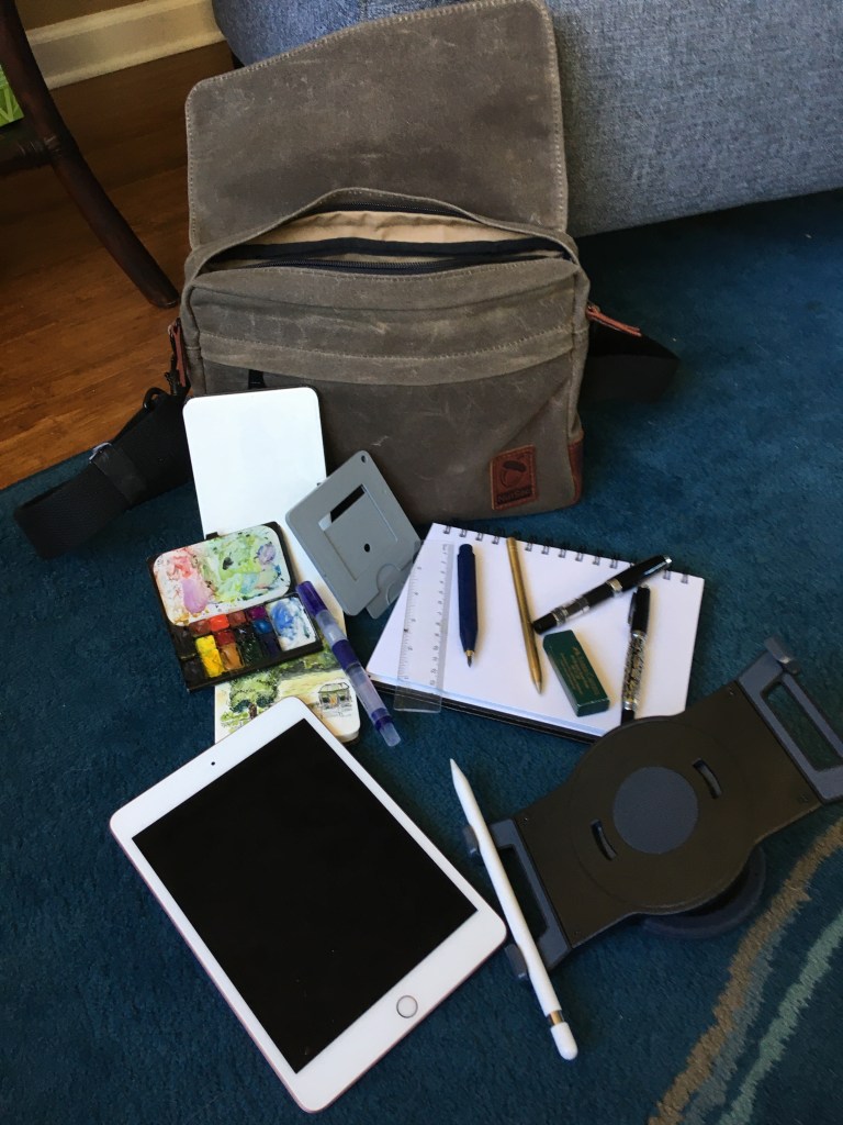 A shoulder bag is most always one of my accouterments. For the 25 years I traveled for work my bag, most recently a Timbuk2, which replaced an Antler bag from Australia, was always packed and ready at a moments notice. It carried my passport, sketching stuff, noise cancelling headphones, etc. In memory of my mother I have a new NutSac Mag-Satch 11, it is perfect and packed.