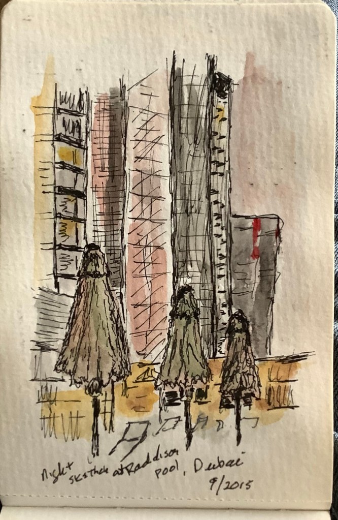 That first night in Dubai, after checking in to the Raddison I went up to the rooftop pool and bar. The lights from the city twinkled in the night, the lights from the pool illuminated the closed umbrellas, so I sketched. A wonderful warm evening in a place I doubt I will ever re-visit, but surely will never forget.