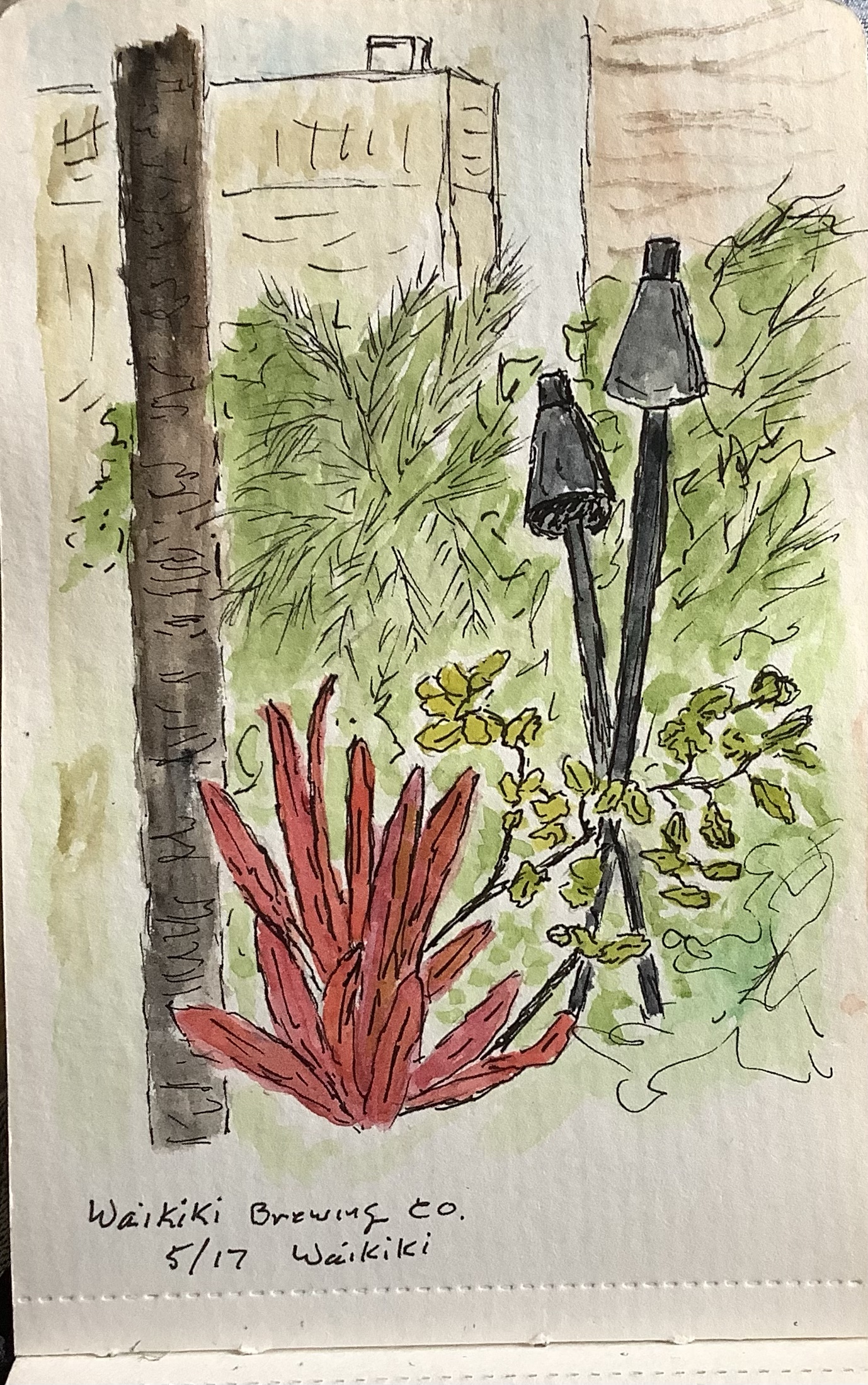 Hawaii for tourists is different than Hawaii for the locals and regular travelers. I have been to Hawaii more times than I can count, few of the trips were for pleasure, yet that does not mean I did not seek out places to hang out; I found many places just a block or two off of Kalakaua that never saw a tourist, yes some were a bit of a dive, but so enjoyable. In 2017 I made a couple of trips teaching project management, I stayed at the Doubletree on Ala Moana. Just a one minute walk down the street is the Waikiki Brewing Company – my go-to hang out for sure. These sketches were done on two separate trips that year – like the others they bring back nice memories.