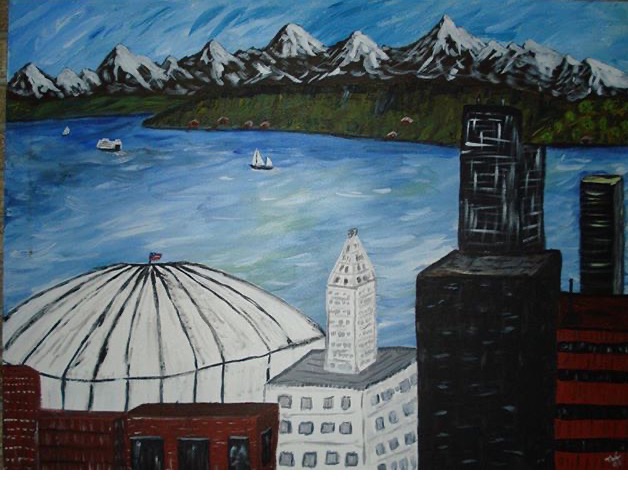 I watched Bob Ross, didn’t have the courage to take a class. I still want to paint everything from distant to near. I enjoyed it, got a bit better, then found I liked large canvases. Here are two early acrylics – Freeway done in 1990, Kingdome was done a bit later. Both are 48×36”