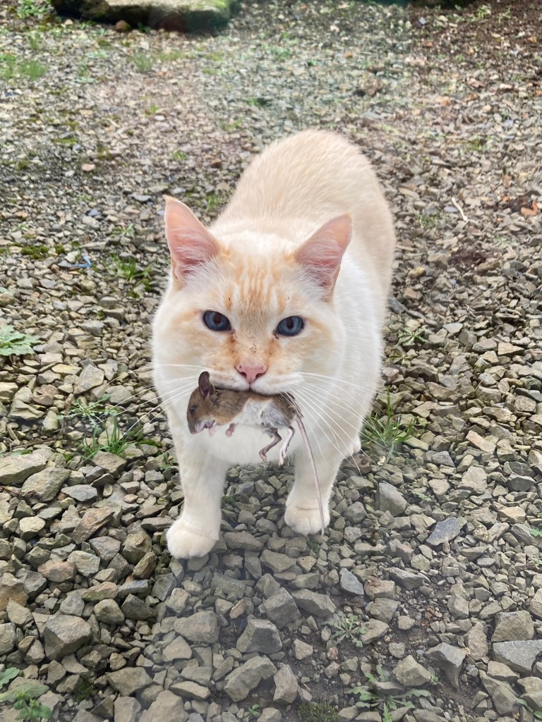 Thankfully he has not lost his touch when it comes to hunting, he is our mighty hunter. I am pretty sure of the count, though Tricia might come with a different number, but I think this is close: 1 in the house while we were gone, the neighbor found it when she came to feed him. 1 or 2 outside, 3 more inside. He always brings them to us for approval, looking quite proud don’t you think? We do live in a rural farm setting so there are mice, but with Neville on the job we sleep well – except of course when he catches one in the night and brings it upstairs while we are sleeping.