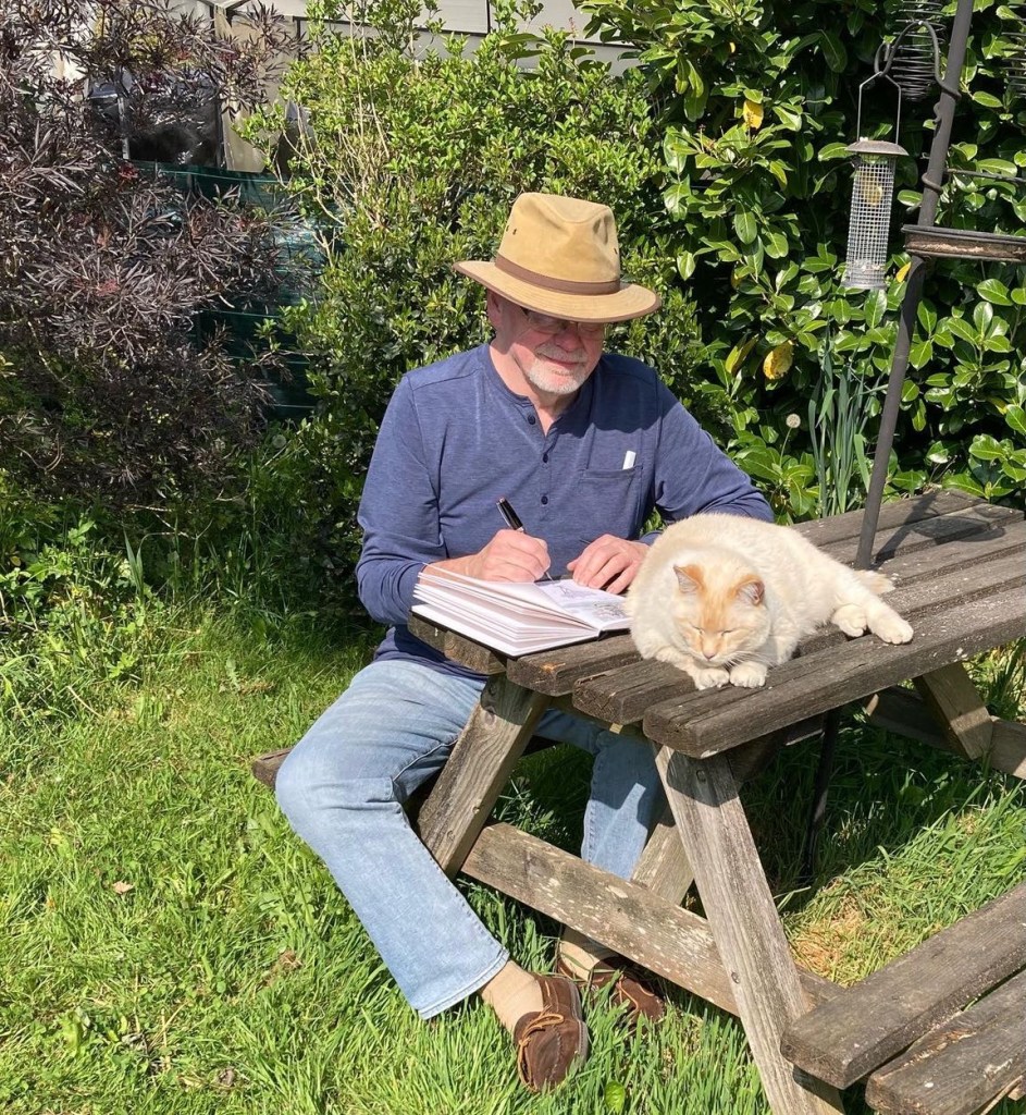 It was spring and warm, Neville loved his rural yard. The old picnic table is good for sharpening claws, sleeping in the sun, and helping me sketch.