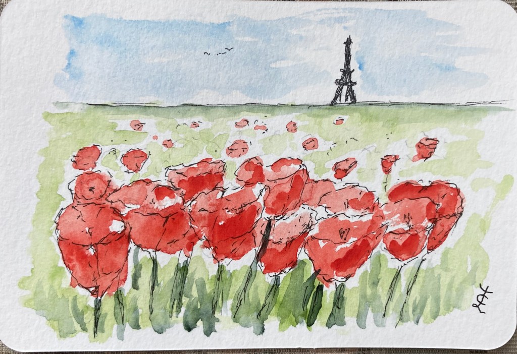 A follower of this blog took me up on my offer to send an original postcard from France. I put this postcard of red poppies, local icons, and the Eiffel Tower in the mail to her this week. I hope it arrives soon. The offer, of course, still stands, so send an email if you would like a postcard from France, or wherever else I happen to be.