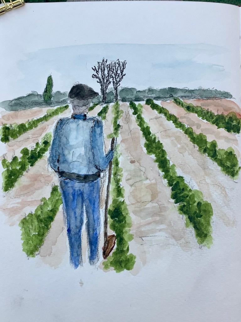 Graphite continues to fascinate me. I did this sketch of a farmer in his field with a Kohl’s-I-Noor 5.6mm lead holder with 6B graphite in it. Then added the watercolor and used just a bit of ink for the distant trees.