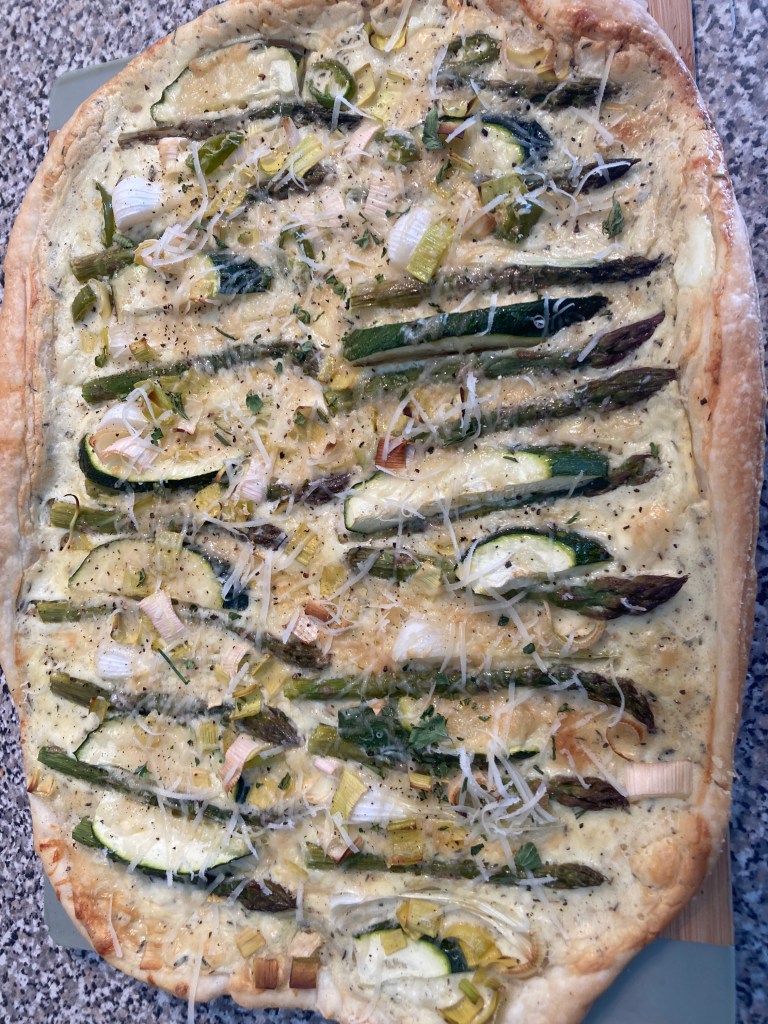 The first layer was crème fraîche. Then asparagus, leek, and sliced zucchini. It was seasoned with a bit of salt and red pepper flakes. (Yes, I do put a bit of red pepper flakes on most everything. Not enough to make it spicy, but even a bit enhances the flavor better than black pepper.) I topped it off with grated Parmesan cheese and baked.
