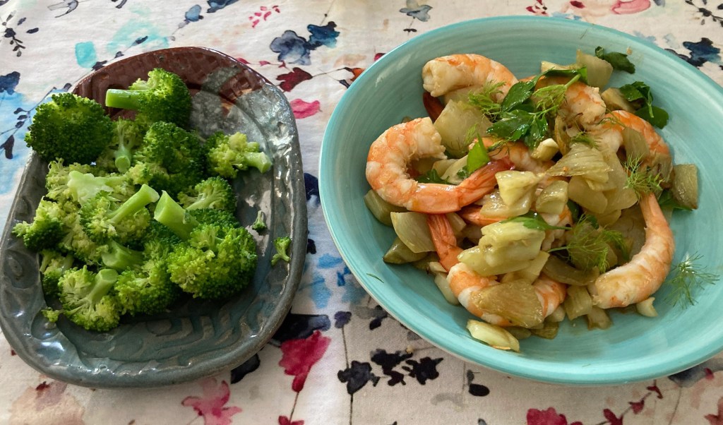 I sautéed diced fennel in olive oil with a bit of garlic and red pepper flakes. Then sautéed the peeled shrimp, added a splash of French sparkling wine, and a handful of parsley from our garden. To quote Ina, “How easy is that?” Then served it with fresh, local, brocoli that was steamed and topped with a bit of butter and salt.
