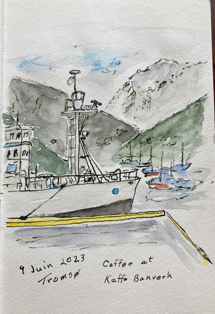 We made it to Tromsø, and we are so glad we came early. We arrived early in the evening on Thursday 8 June. Our hotel is right at the harbor, so, of course, we went for a walk and found food. The next morning I got up early for coffee and a sketch.