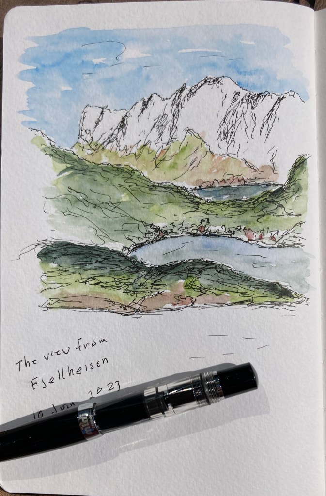 On Saturday we took the Fjellheisen, a mountain cable car, up to Storsteinen mountain. Tricia will be blogging in the next week or so with some amazing photos of the view; I did a sketch to capture the moment.