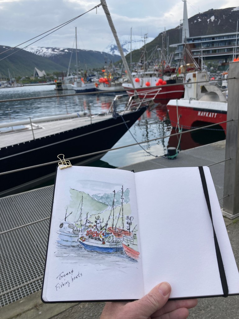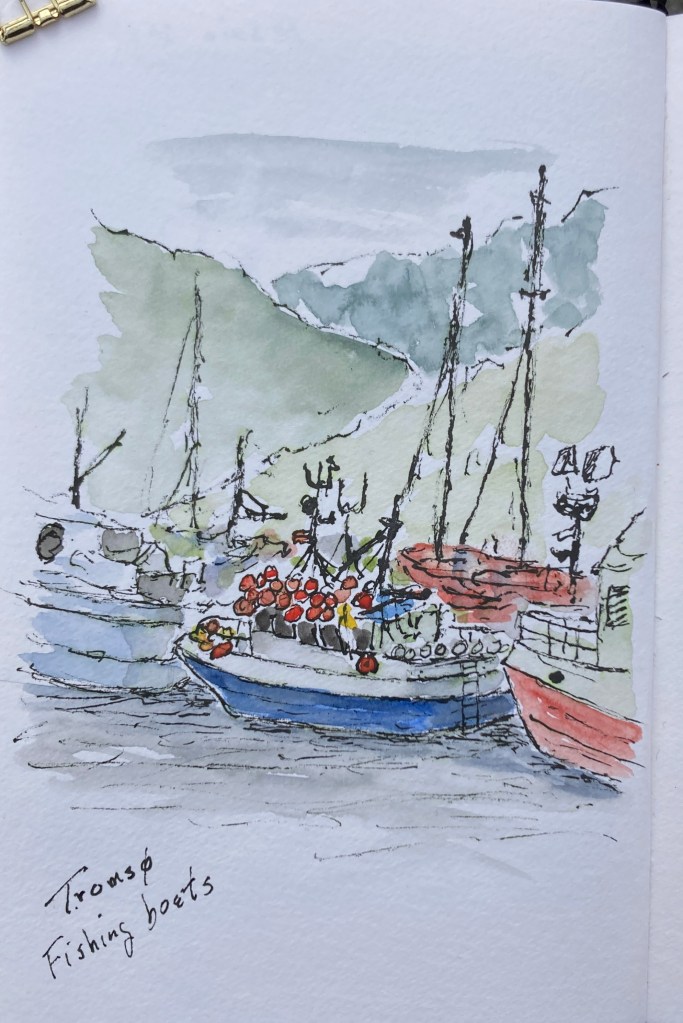 I was just reading Sarah’s blog (Travel with me) earlier today where she also visited Tromsø recently – it seems to be a popular place. I like your sketch of the fishing boats. Enjoy your cruise!