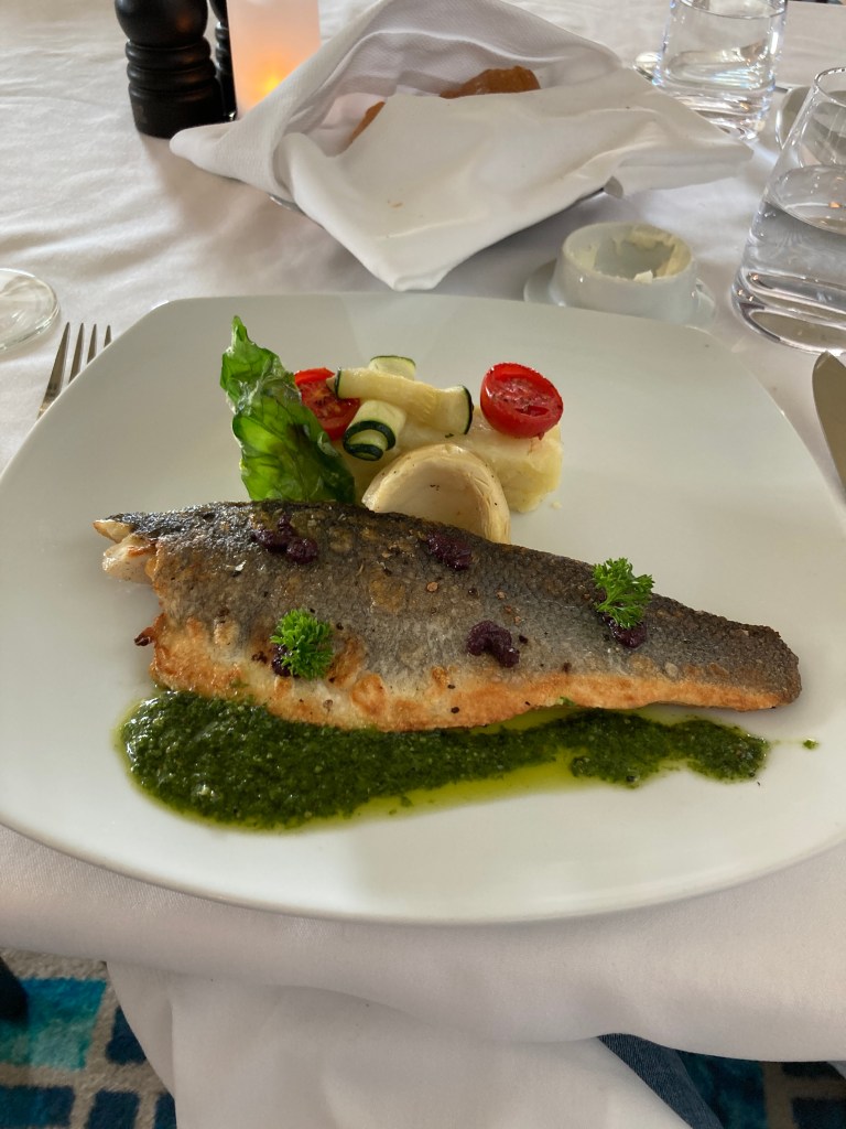 Even though we were not next to the window, as we usually are because we get there early, we had a nice view of the water. My sea bass was cooked just right. The server remembered us and we chatted about her home country. Sure beats the rumble and tumble of the buffet line, and the cramped tables that would do a school caffateria proud.