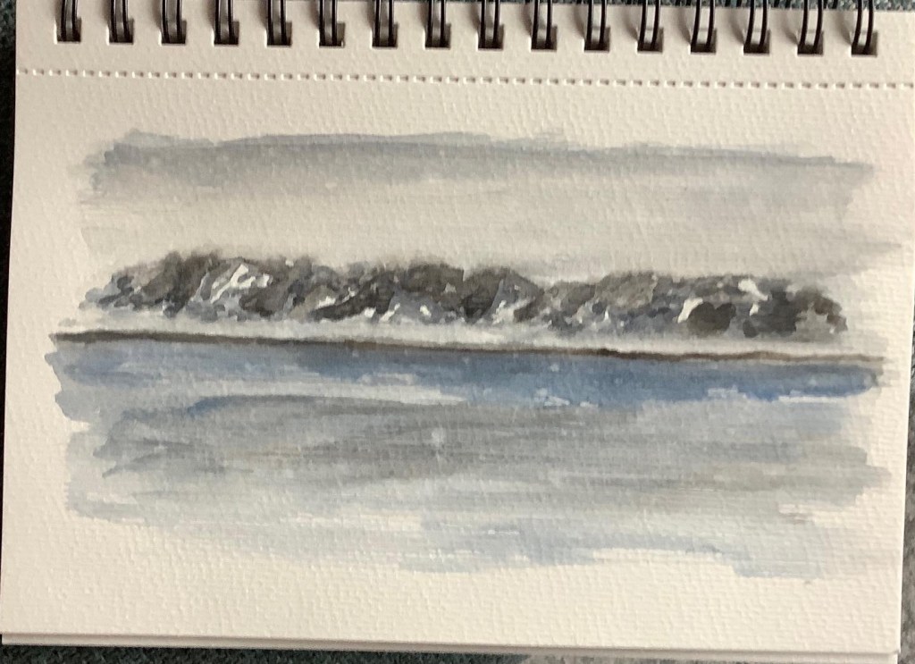I was up early Sunday morning to sketch our arrival. Like most of the weather and landscape here, it was shades of gray.