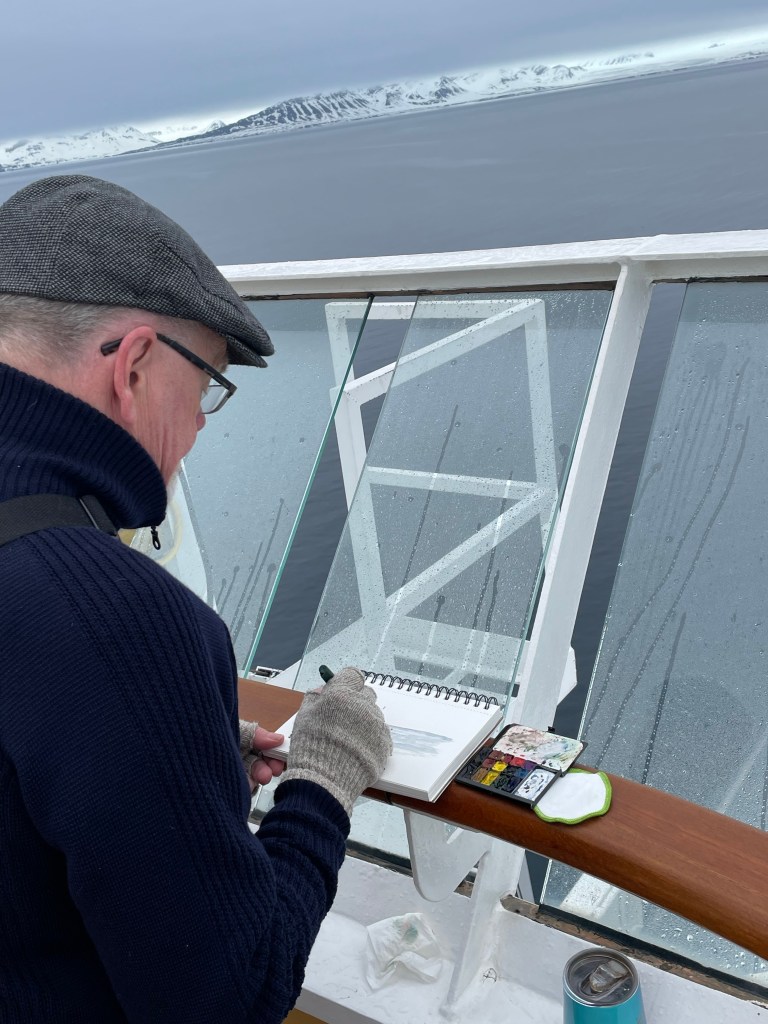 Great sketches, as always—and special that someone took photos of you doing just that on the ship. Even grand adventures have some misadventures, and it sounds like that’s what you experienced the last few days. SO glad you had nurse Tricia and you’re feeling better. Probably something odd you ate (and we know you can be an adventurous eater!) Once on a cruise in Greece I drank a glass of warm ‘fresh’ orange juice from a street vendor…and was sick in the cabin for 24 hours. Ah, Memories…
