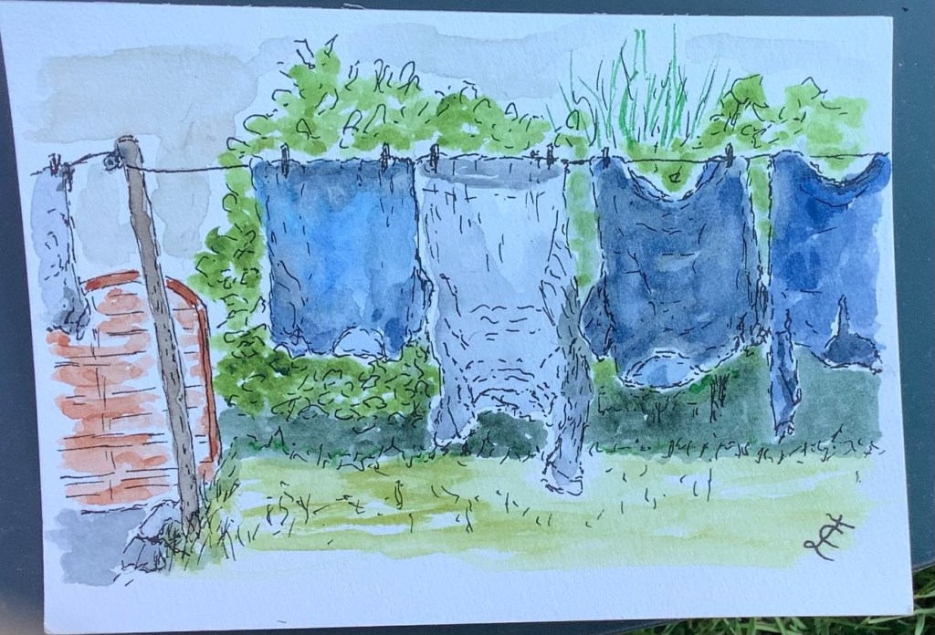 The weather turned hot, yet outside, in the shade of the umbrella, it was perfect to sketch a postcard for our daughter while the laundry quickly dried in the heat.