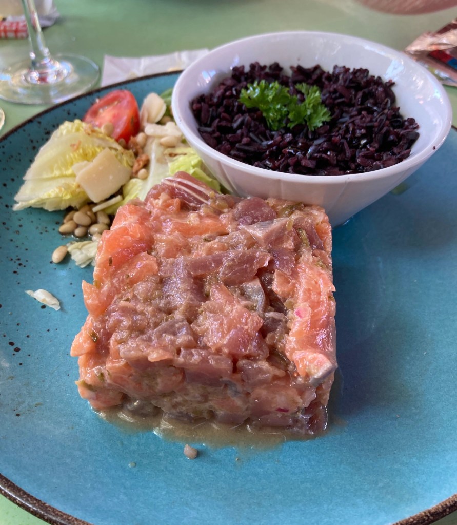 For my main I had a tartare of tuna and salmon. It was interesting that they brought me a bottle of Tabasco, which did in fact work quite well.