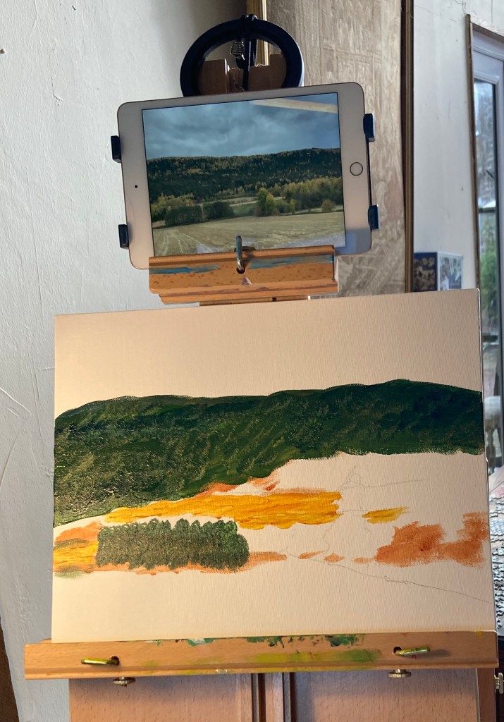 One of my getting-back-to-acrylic purchases was a French Easel, so popular worldwide for plein-aire painters, I like that I got mine IN France. My iPad easily attached to the easel so I could see the reference photo.