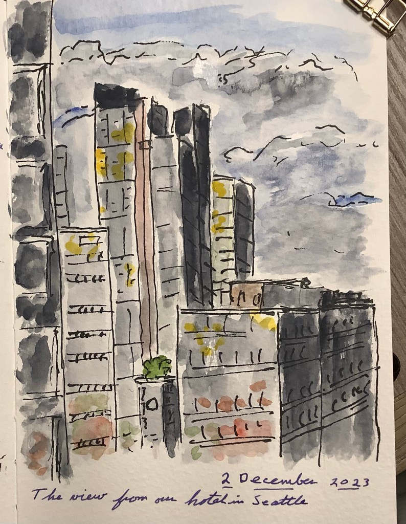 We arrived in Seattle just a week ago. The first few nights we spent in downtown Seattle to adjust to the jet lag and do a little shopping. Here are a couple sketches from Seattle.