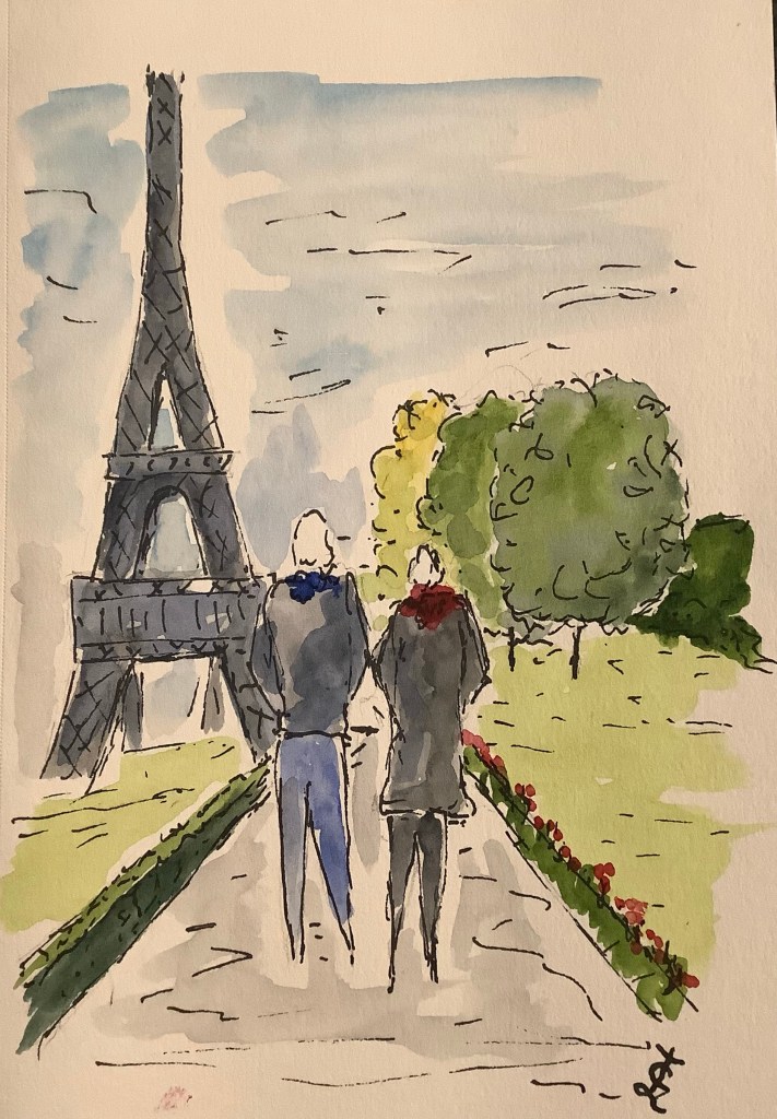 Thoroughly enjoyable! The sun and olive tree sketch is so evocative of Provence; just beautiful. We are so glad you have two countries–and are selfishly pleased that we’ve been able to spend time with you and Tricia in both of them this year. Thanks for the nice comments about our decor–and MERCI BEAUCOUP for the amazing sketch of ‘us’ in front of the Eiffel Tower. It’s not only lovely to have friends who enrich our lives–but to have friends who are SO creative! Enjoy the rest of your trip before ‘returning home!’